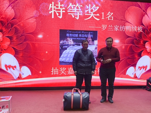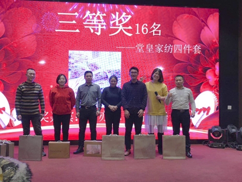 年會(huì)上,穿插在節(jié)目中的抽獎(jiǎng)環(huán)節(jié)也是一大亮點(diǎn)。隨著三等獎(jiǎng)、二等獎(jiǎng)、一等獎(jiǎng)以及特等獎(jiǎng)的抽取,不斷掀起年會(huì)高潮。今年的年會(huì)大獎(jiǎng)讓你拿到手軟,堂皇家紡四件套、銀座拉桿箱、松下電飯煲、更有羅蘭家紡鴨絨被。這些獎(jiǎng)品令人抓狂,心儀已久的獎(jiǎng)品正在向大家招手,簡(jiǎn)直不要太幸福。